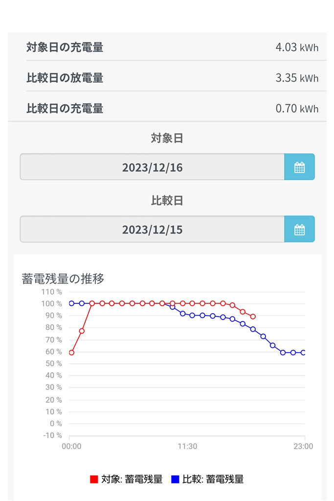 放電3.35kWh(40%消費)→充電4.03kWh(100%戻る)