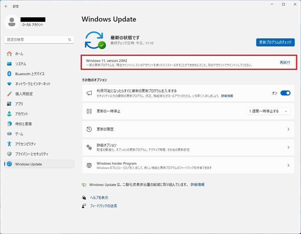 BWin11 Pro 22H2 → 23J2 アップグレード