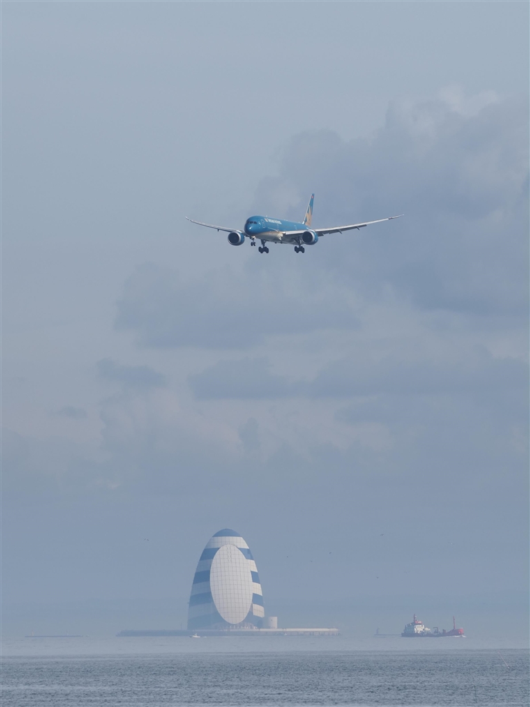 東京湾に建つ風の塔とハノイ発ベトナム航空B787−9