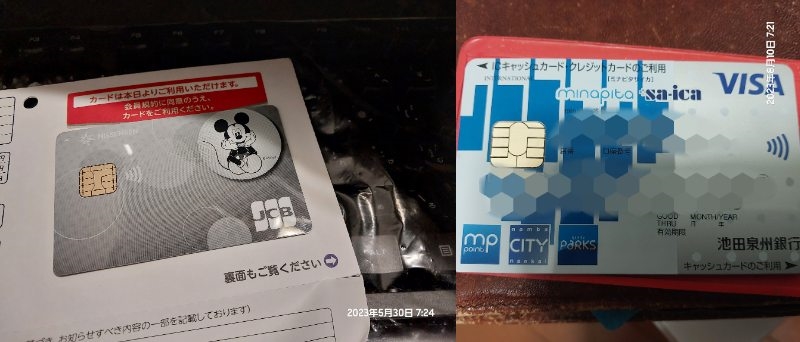 日専連のJCBと地銀の池田泉州銀行のキャッシュカード一体型のVISAにて。