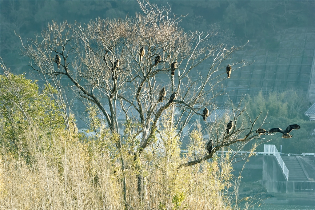 遠くの対岸にトビが群れてました