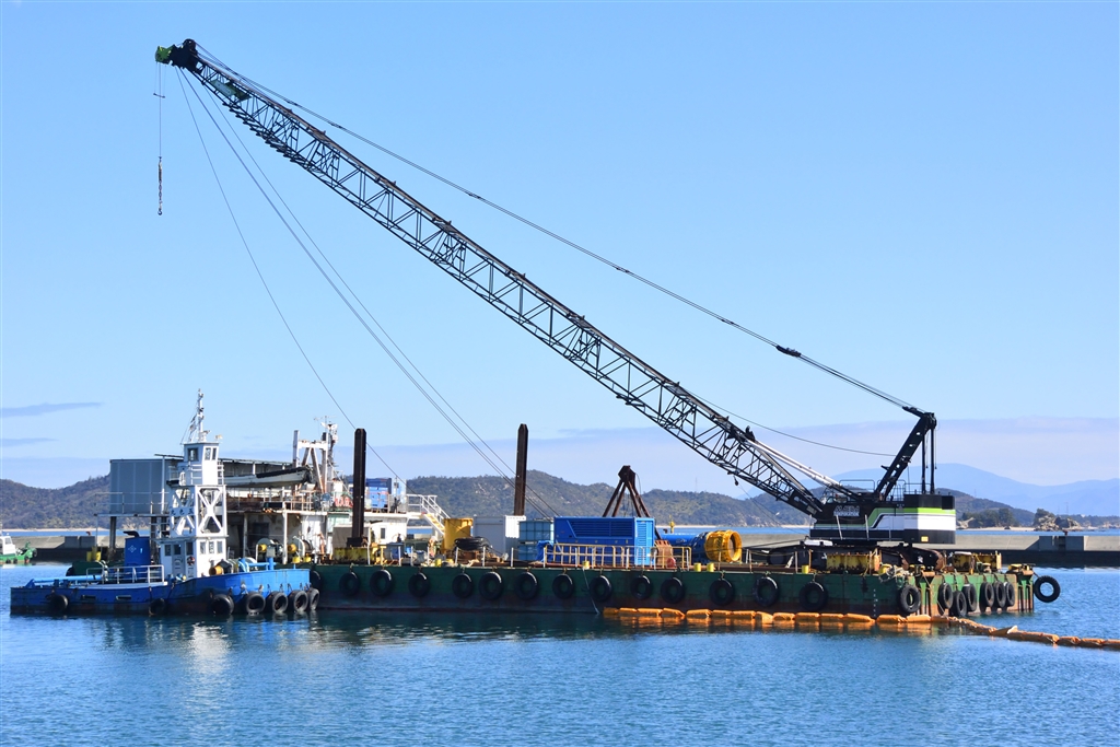 吊り上げるとクレーンの台船は沈むのでバランスとるのが難しい