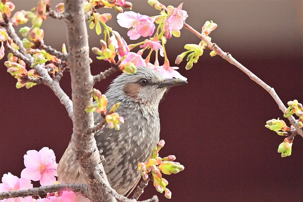 河津桜の冠を戴く ヒヨドリ君
