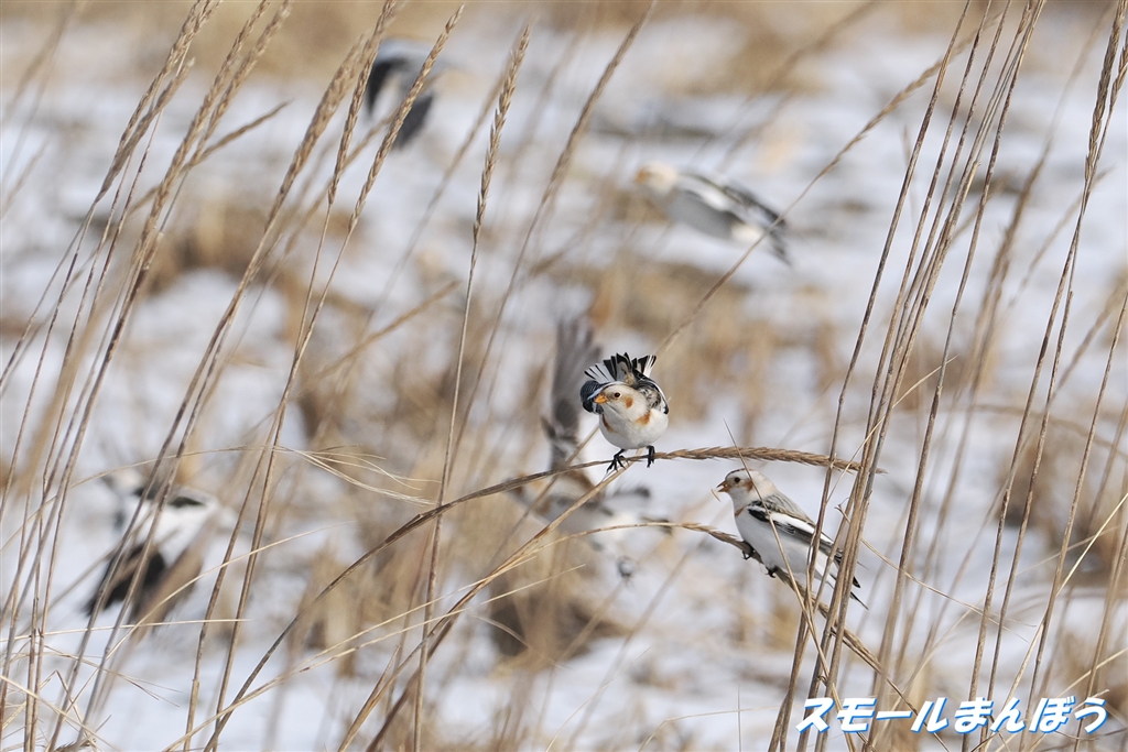風で揺られるため微調整中のユキホオジロ