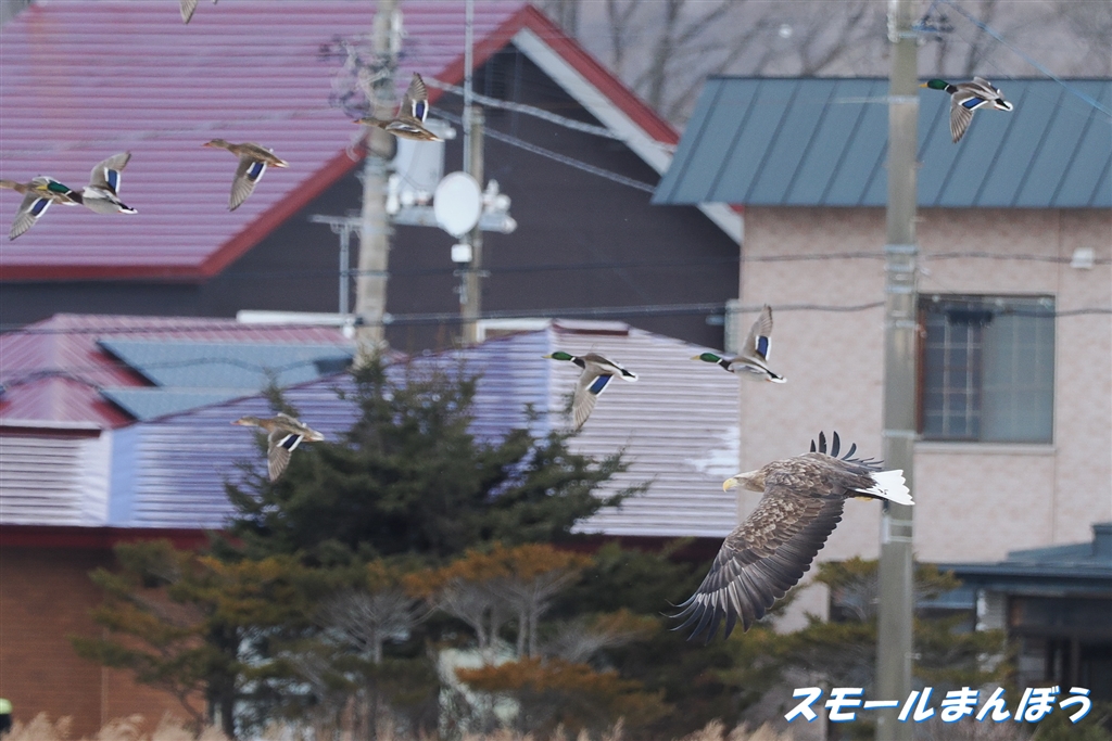 バックが・・・ですが、オジロワシが飛ぶとカモ達が逃げます