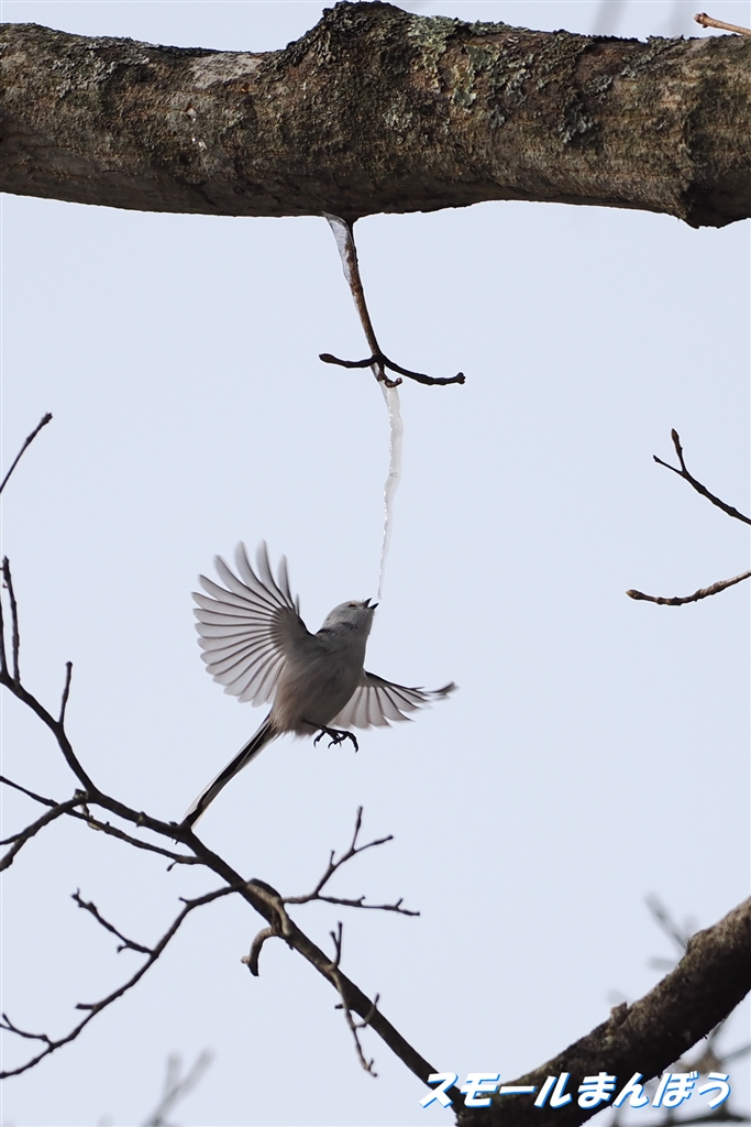 逆光でした・・・氷柱を舐めるシマエナガさん(>_<)