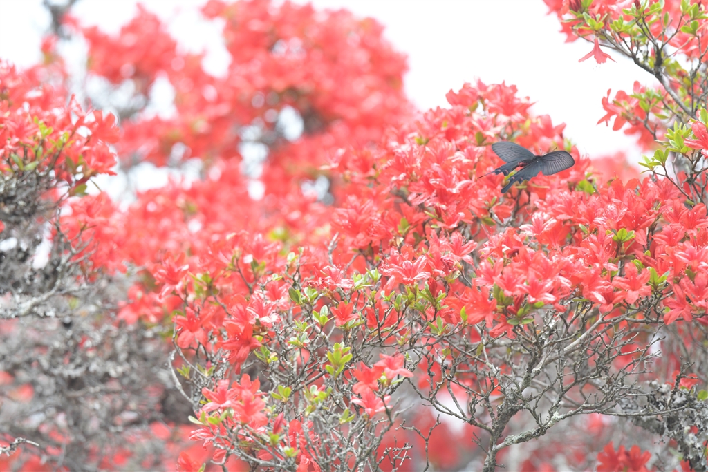 我が家の霧島ツツジと遊びに来るアゲハ