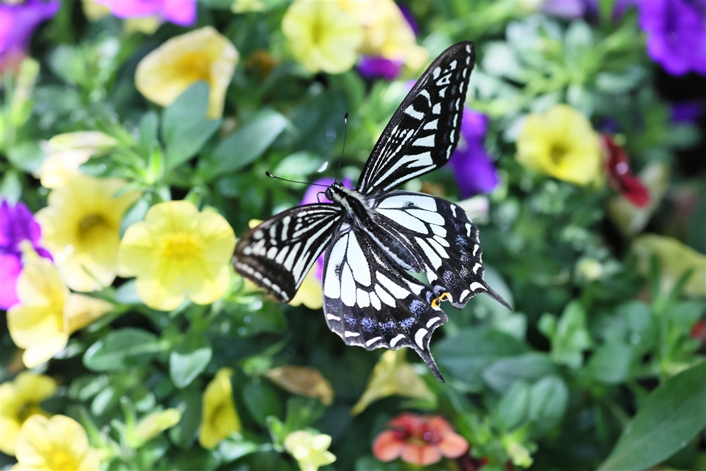 色とりどりの花の処でチョウを待ち構えていました