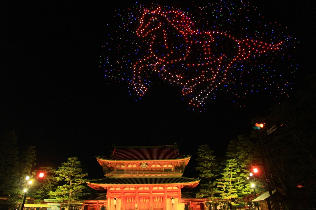 点在するドローンが次第に集まって馬の絵を形づくる