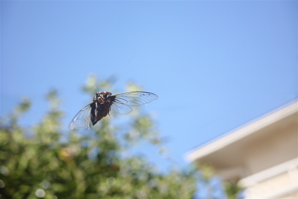 向こうの木から飛び出したクマゼミを撮る