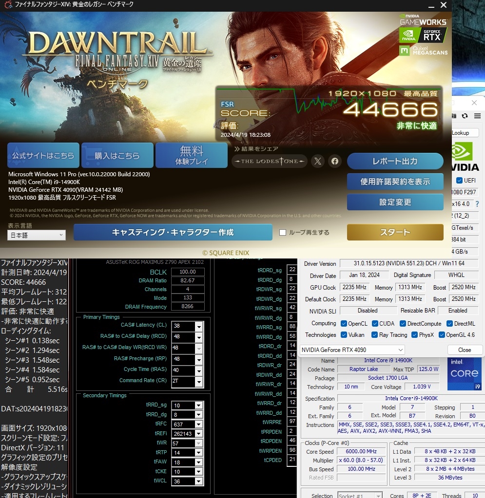 FF14暁月 14900K@6.0 + 4090 Phantom 8266CL38(tRFC 637) UnCoreMax51 APO 29℃
