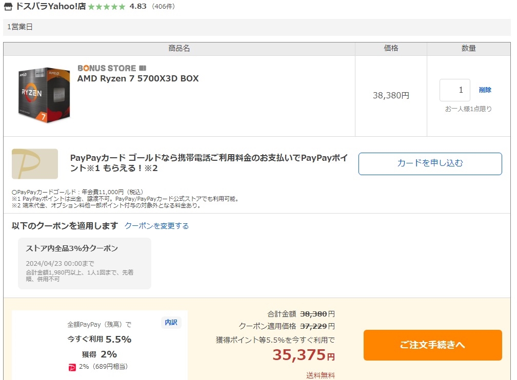 5700X3D 今日04/22(月)での様子 クーポン適応