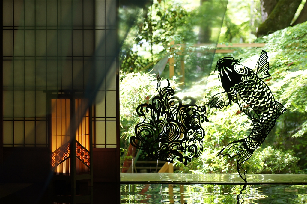 本坊には影絵の装飾、手前には薄い布が棚引く。