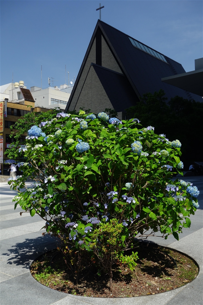 植え込みのアジサイといつもの教会