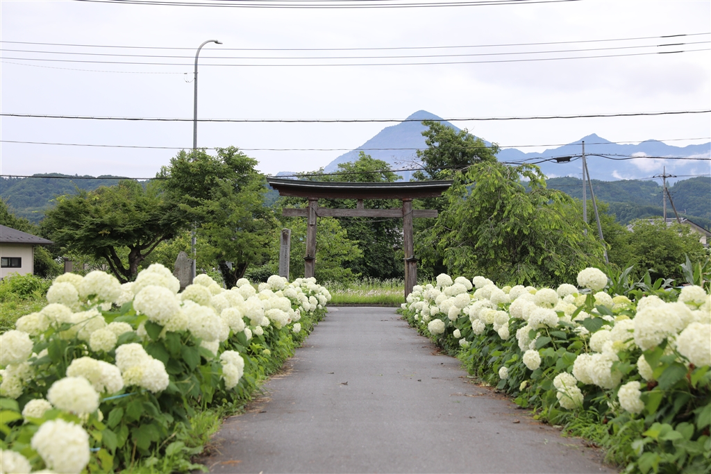 鳥居とアナベルと武甲山