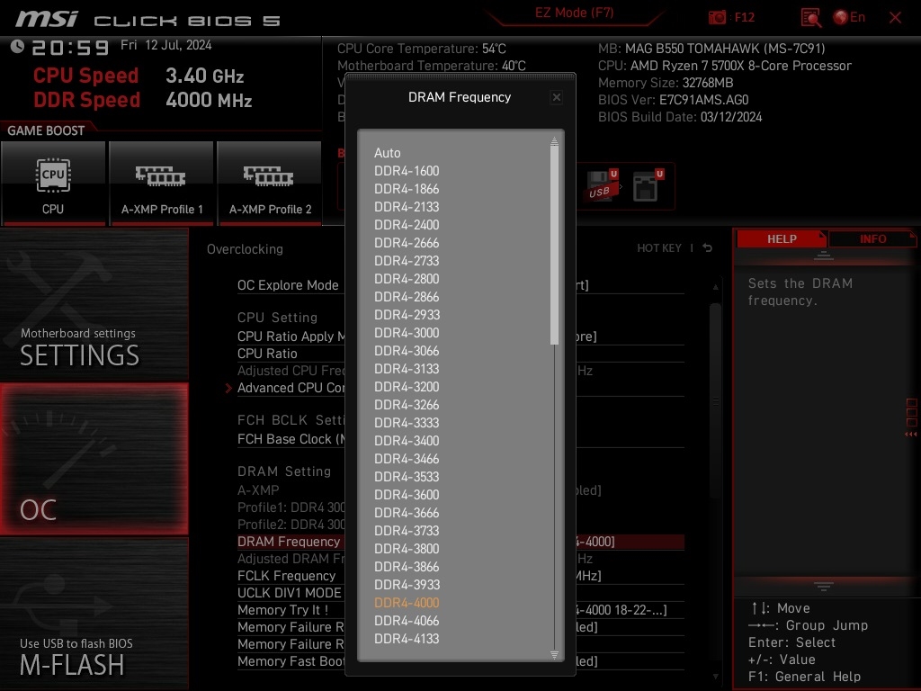 MAG B550 TOMAHAWK BIOS メモリークロック選択