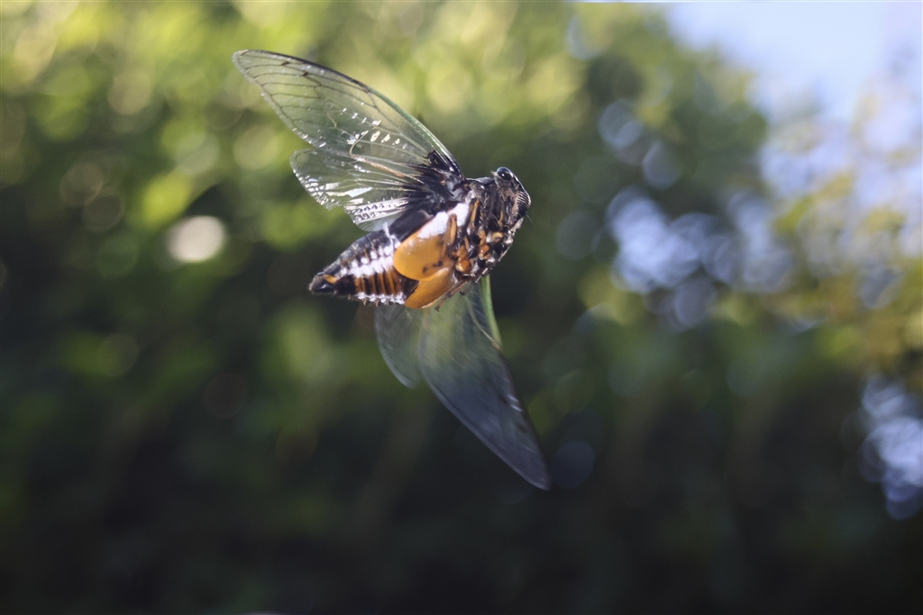 クマゼミは重く大きな図体の割に翅が小さいのでバタバタと激しく羽ばたいて飛ぶ