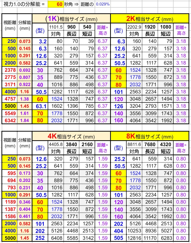 視力1.0と視距離⇔画面サイズ