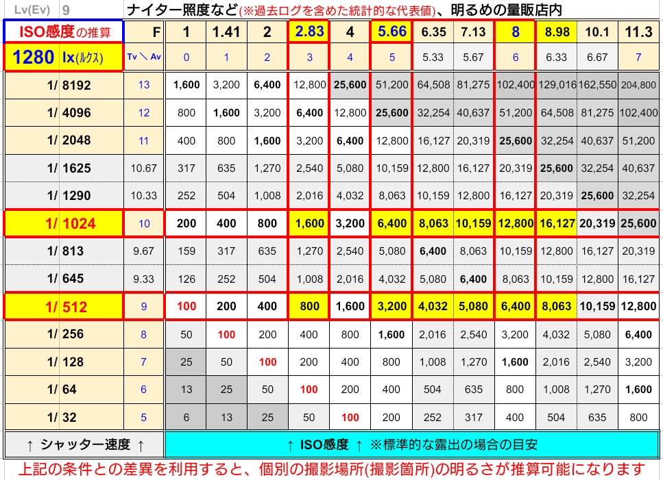 【ナイター】1280 lx(ルクス)⇒Lv(Ev)9 撮影条件例