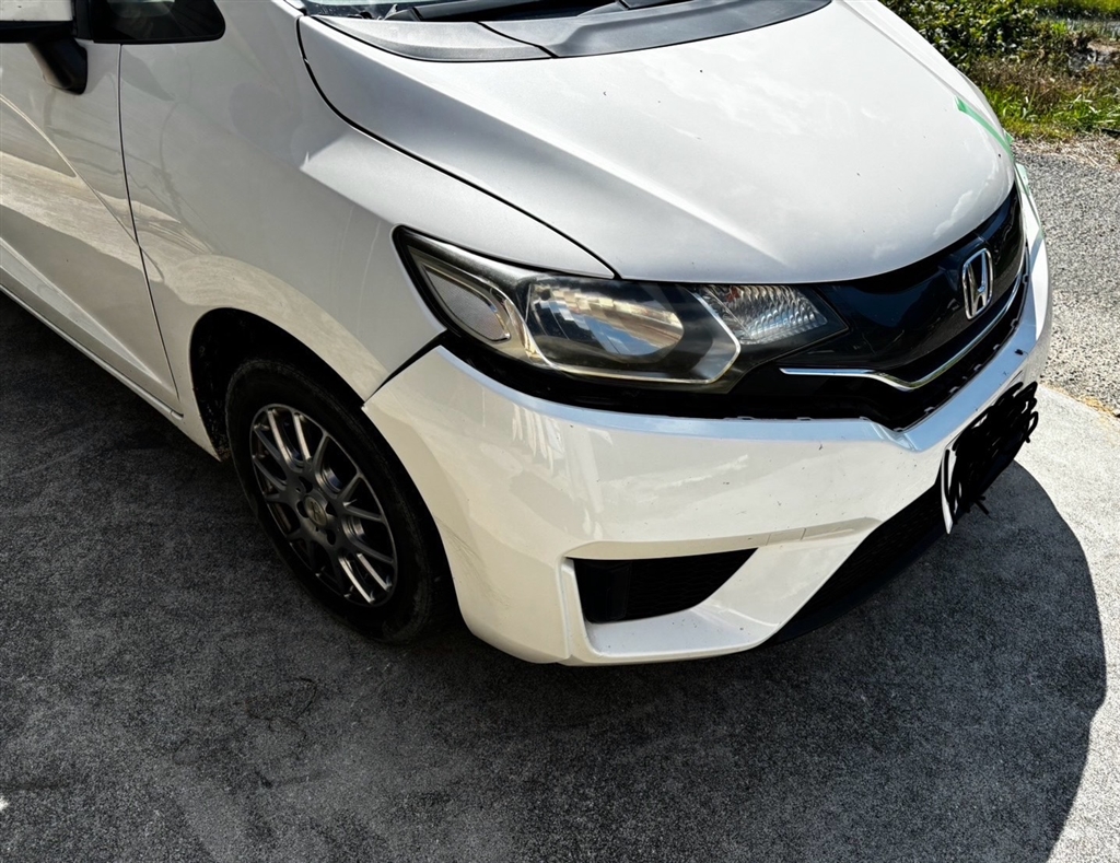 バンパーが外れたフィットです。
