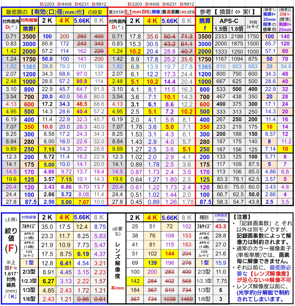 【1 mm解像】最遠距離とその条件 ※上表の赤枠内参照
