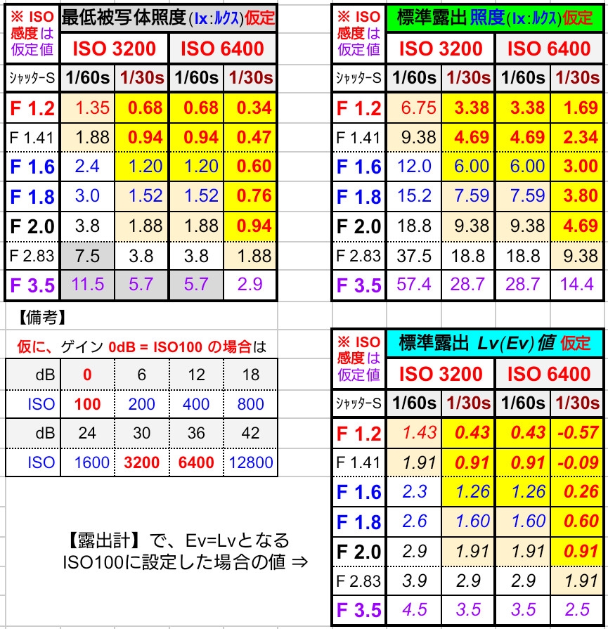 最低被写体照度の他に、標準露出照度と Lv(Ev)値も併記