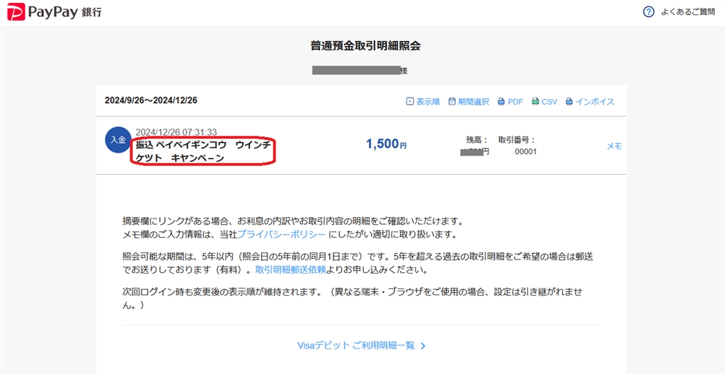 現金1500円が本日、PayPay銀行に入金されました!!