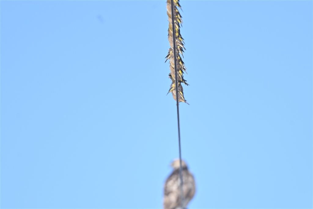 至近距離にノスリをなめ切ったカワラヒワの群れが