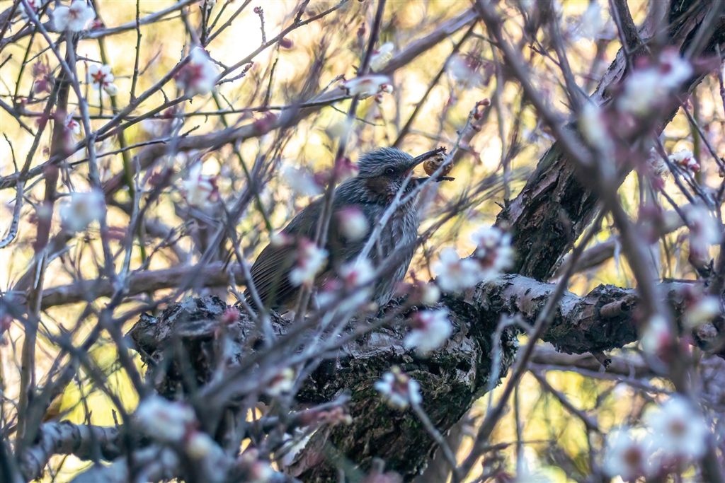 梅の木の陰で何やら啄んでいるヒヨドリ