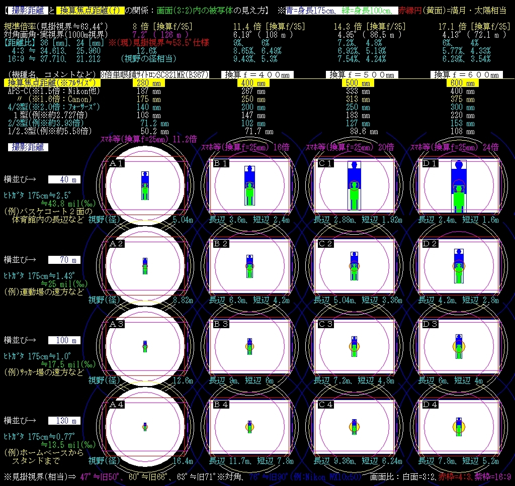 撮影距離 40~130m、 【B列】が 実f=250mm(APS-C 1.6倍) ⇒ 換算f=400mm