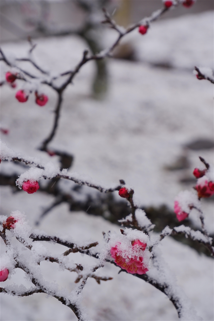 梅の花に雪が積もっています。