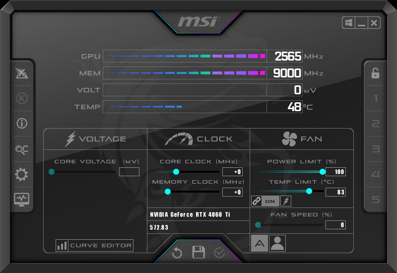 msi afterburnerの画像です。100%で常時回転になっていると思います