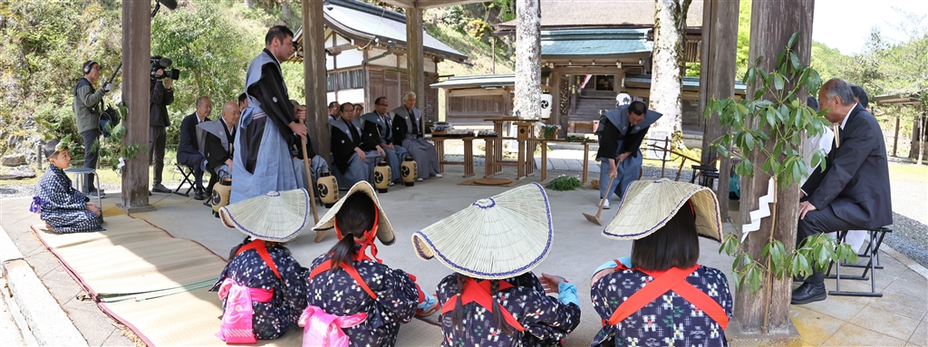「田原の御田」が奉納されている情景(3ショットをパノラマ合成)