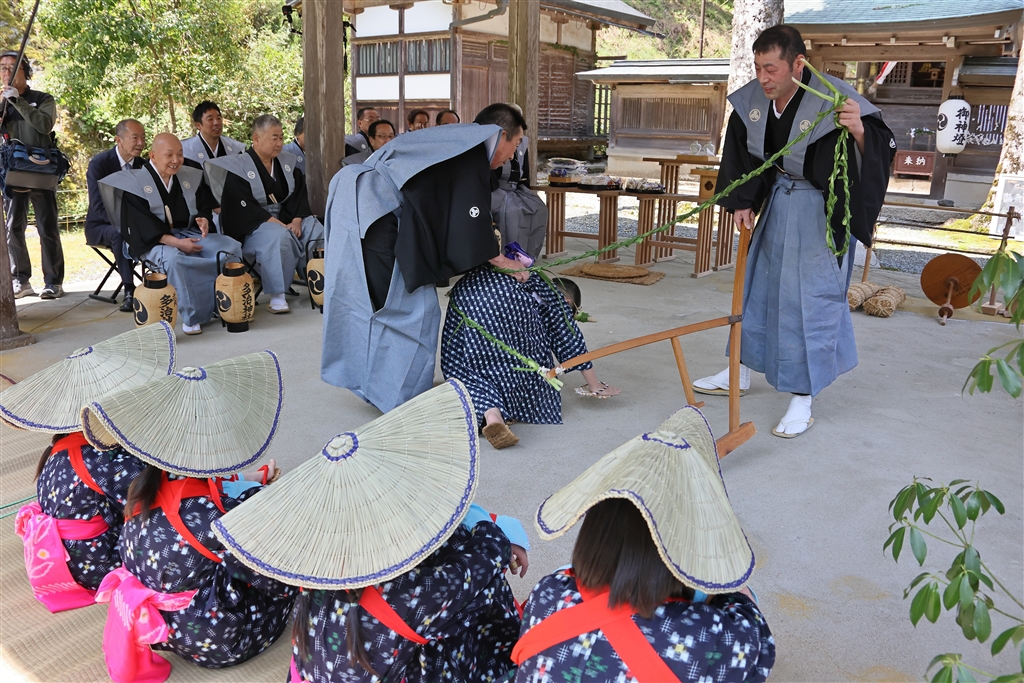 田男(作太郎と作次郎)が農耕牛を使って田を鋤き耕す