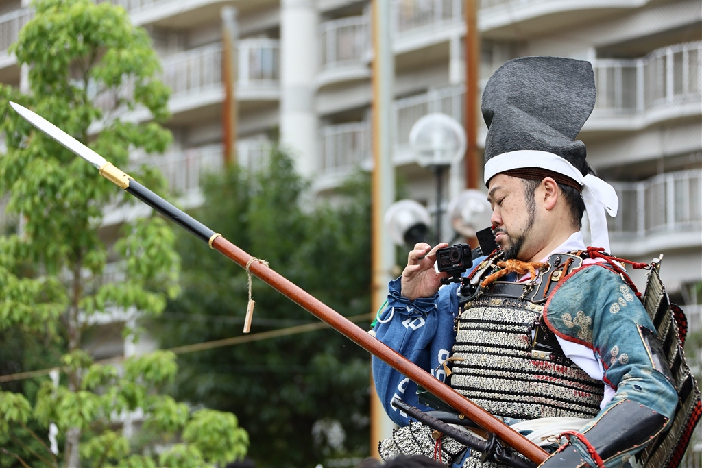 騎馬の武者が行列進行中にビデオ撮影のチェック(いい絵が映せたかな)