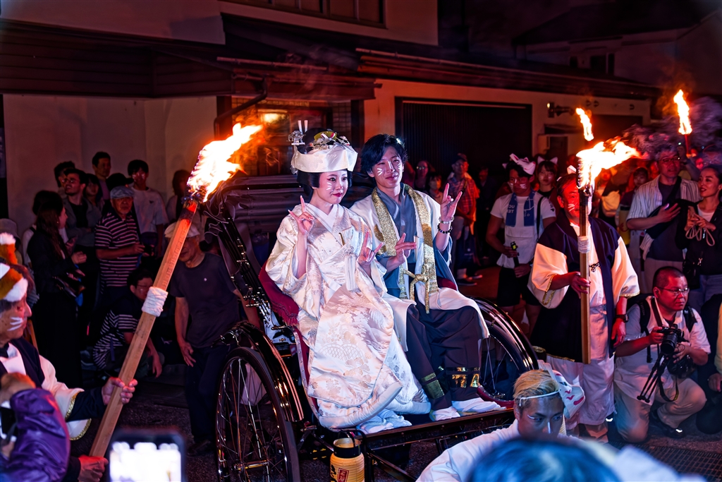 日が落ちて松明の灯りの中で行われた嫁入り行列は幻想的だが撮りにくい
