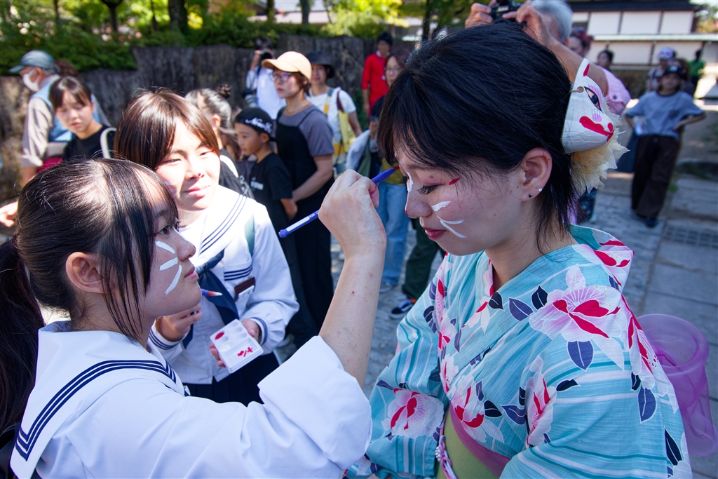 着物を着てきつねメークをしきつねのお面を付けるのが標準の祭り参加スタイル