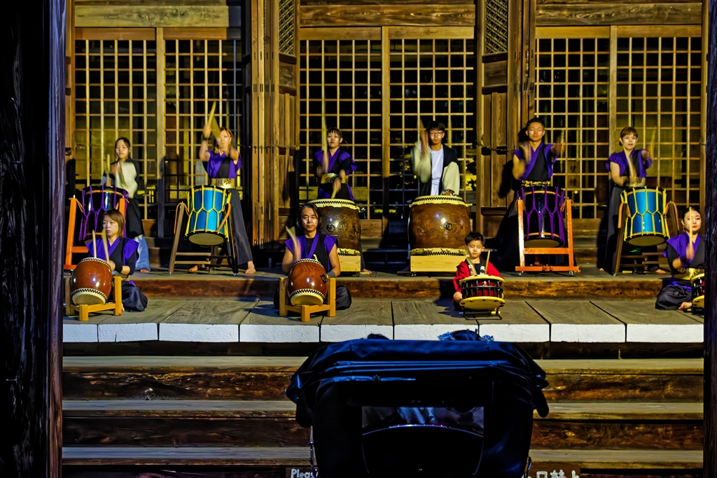 花嫁・花婿が乗るお披露目人力車の前で太鼓演奏が披露された