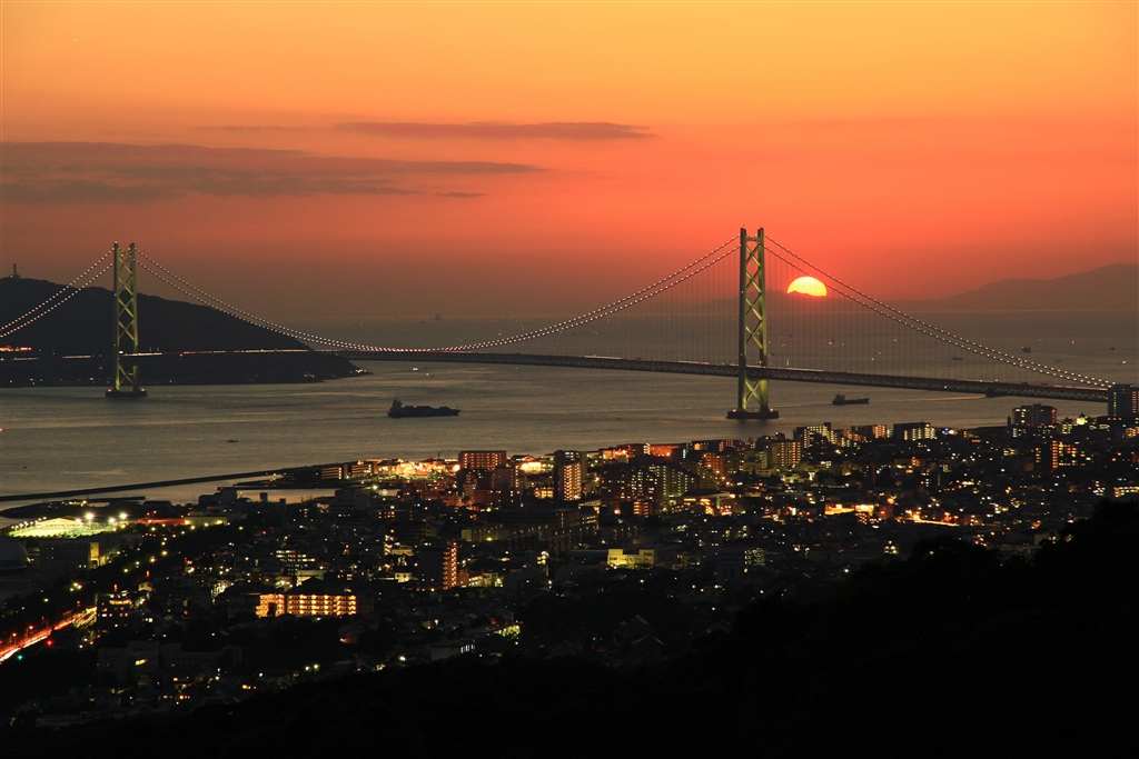 上空は明るさが残る夕暮れ、地上は夜になっている街 Part1