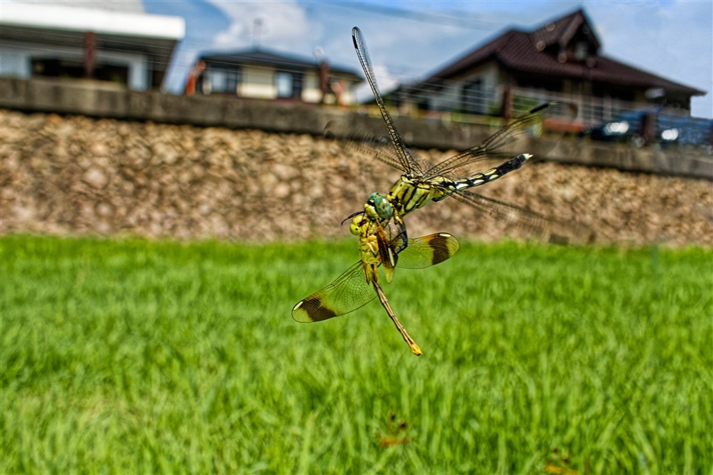 弱肉強食(草むらの上を飛んでいたミヤマアカネがシオカラトンボに捕食された瞬間)