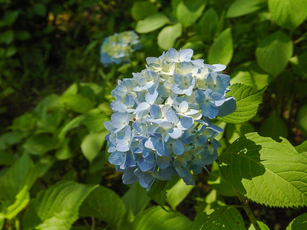 ほんのりと色付いたアジサイの色は