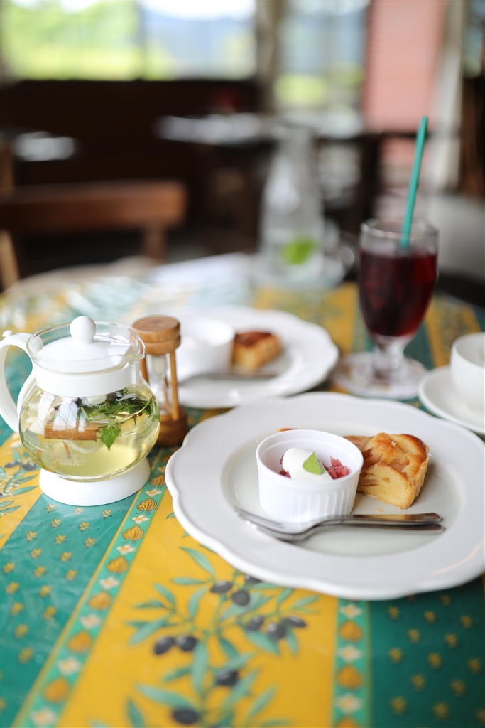 ハーブティーとデザートのタルト