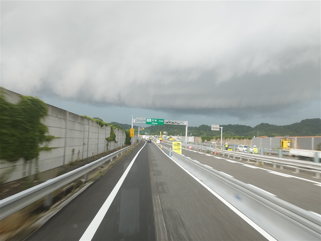 彦根の手前です。水平線当たりに明らかに黒い帯が!