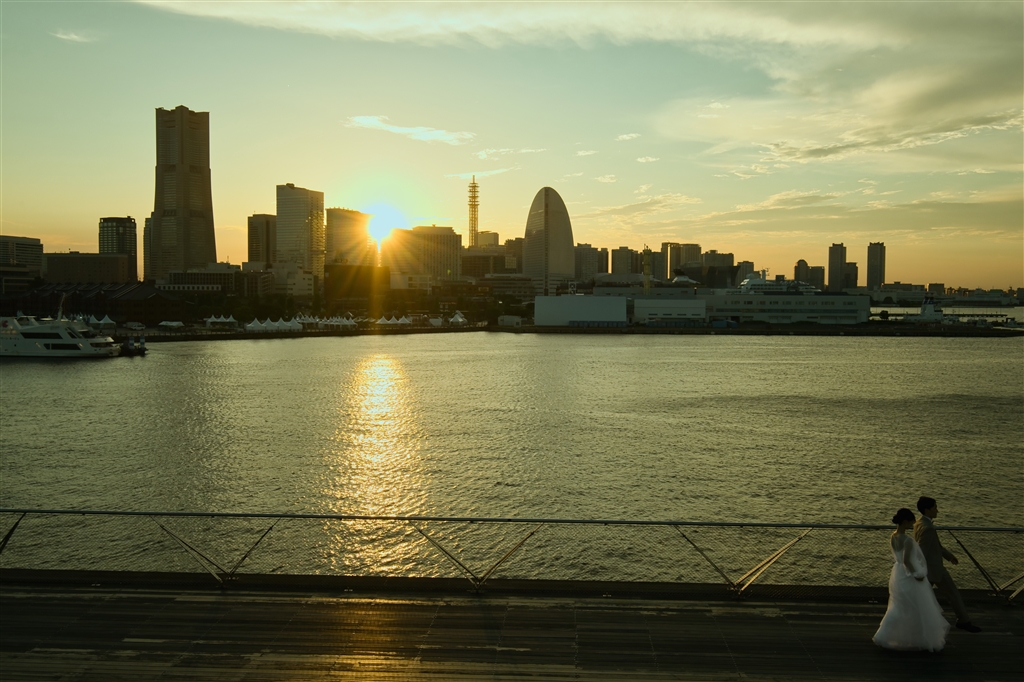 夏は、ビルの間に陽が沈みます