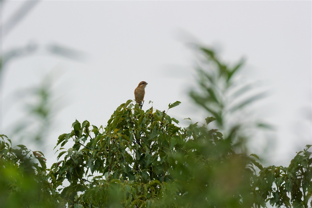 15〜20m先の樹木の上で啼くモズを望遠端で