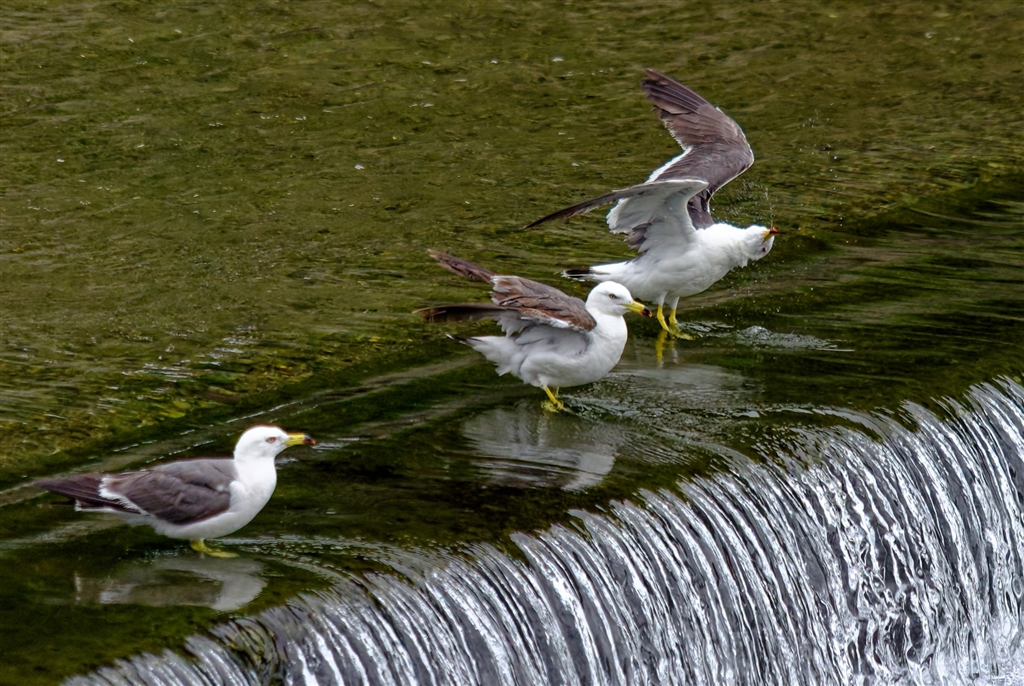 黄色い脚に嘴の前の黒と赤が特徴のウミネコ成鳥