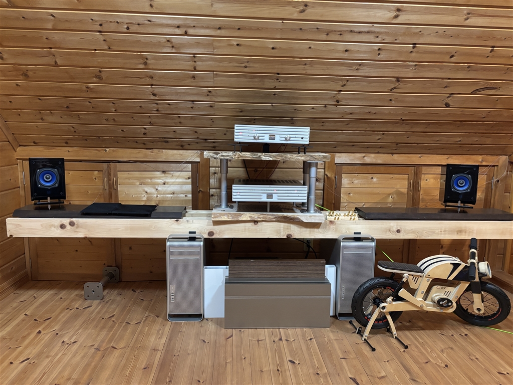 台はMacproに檜材4本SP部はゴム集成材 DAC下は楓無垢材 アンプ下は樺無垢材
