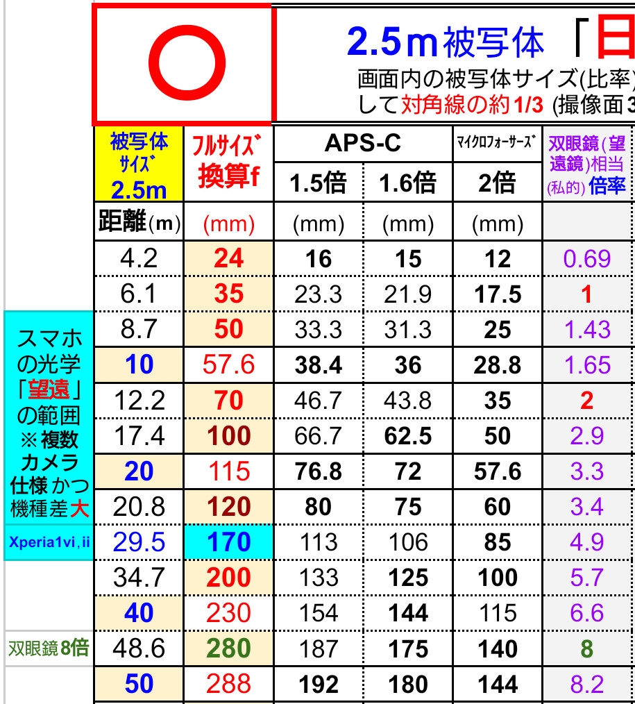 2.5m(被写体サイズ)【撮影距離と換算f、他の実f】短距離域※抜粋「日の丸」比率