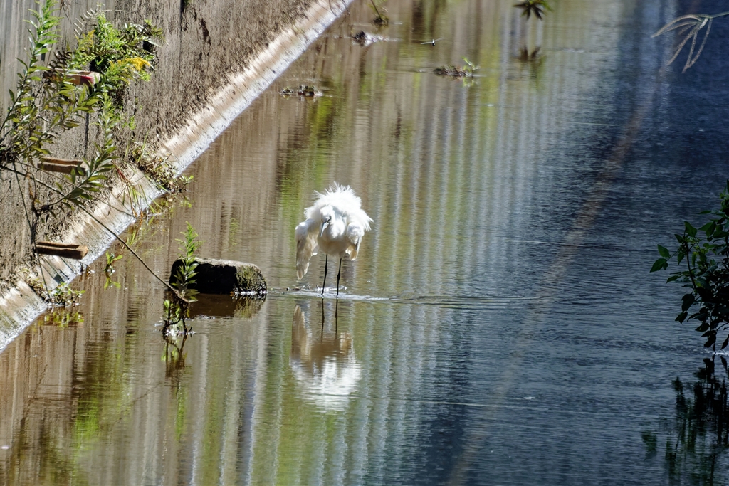 田んぼの水路にコサギが居て 翅を膨らせていました