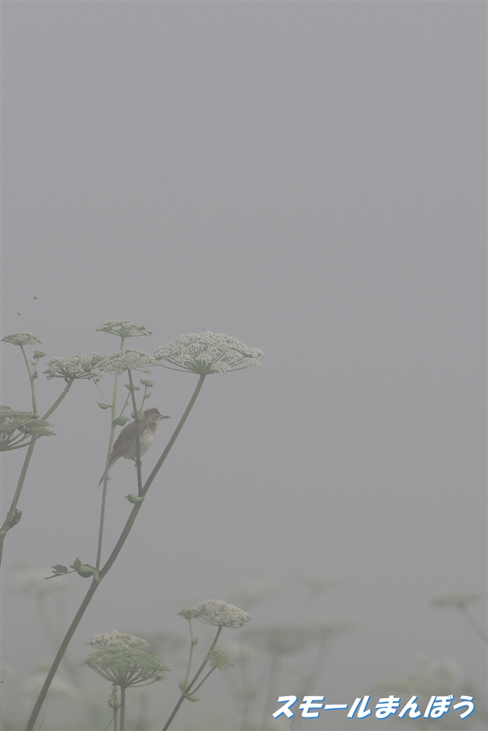 霧の中遠いところでオオヨシキリを発見